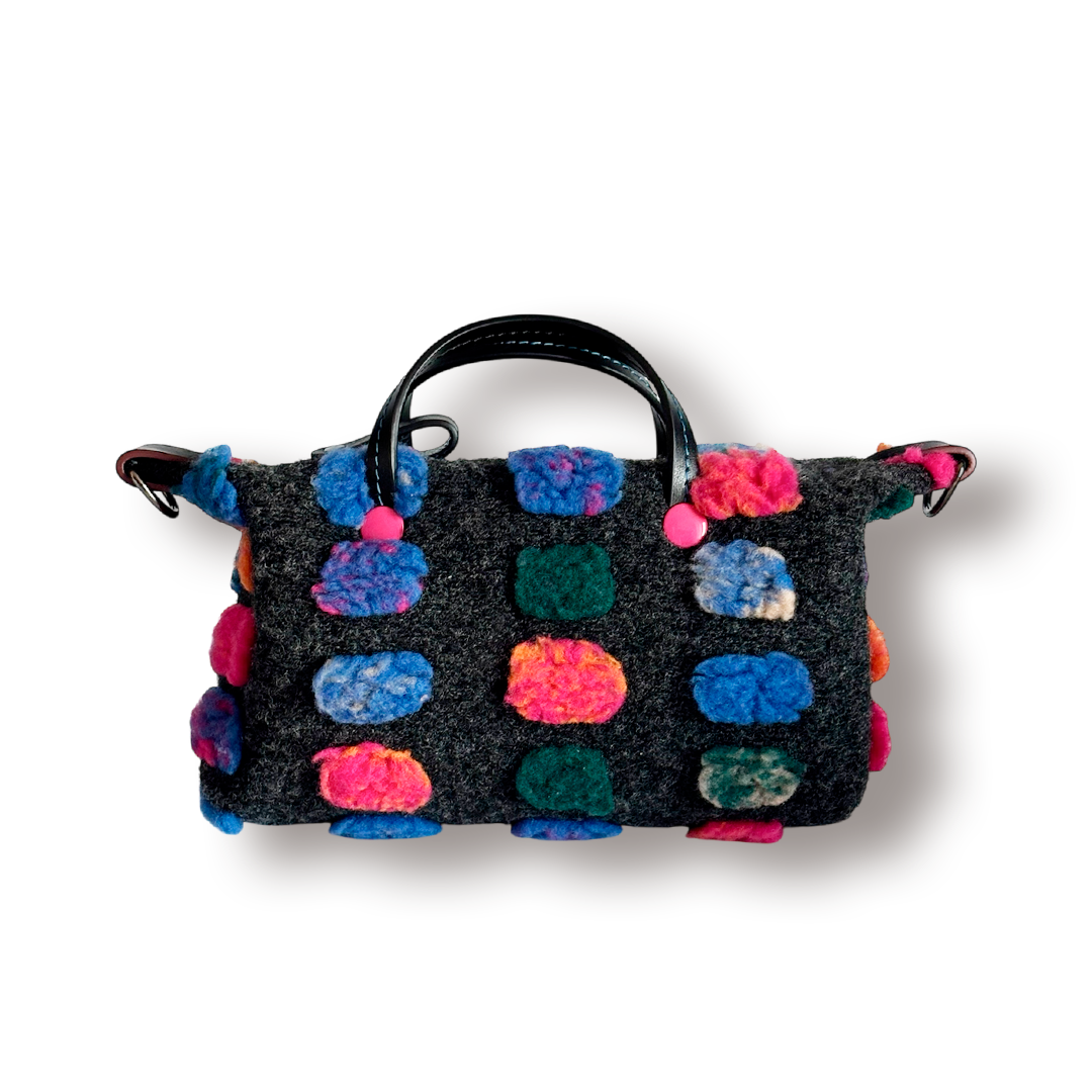 Realizado en tejido de peluche. Asas en cuero lujadas en sus laterales en color para generar contraste. Diseñado para llevar básicos como el móvil con un monedero o una botellita de agua. Se incluye correa para llevarlo al hombro o como bandolera.